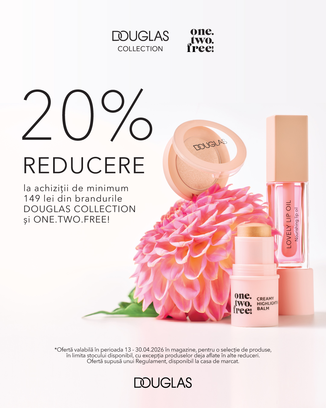 La Douglas te bucuri de -20% reducere la achiziții de minimum 149 lei din brandurile Douglas Collection și One.Two.Free!